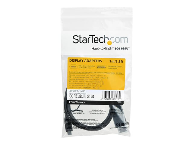 Denna USB-C till DisplayPort 1.4-kabel gör att du kan ansluta din USB Type-C (eller Thunderbolt 3 )-enhet till en DisplayPort-skärm, eller en DP-enhet till en USB-C-skärm med endast en kabel. Oöverträffad prestanda med stöd för 8K 30 Hz Denna 8K DP 1.4-kabeladapter stöder fyra gånger så hög upplösning som 4K och tillhandahåller fantastisk UHD-kvalitet med upplösningar upp till 7 680×4 320 och har även HBR3-funktionalitet, vilket ger en bandbredd på upp till 32,4 Gbit/s. Videokabeln är bakåtkompatibel med 4K- och 1080p-bildskärmar, vilket gör den till ett utmärkt tillbehör för hem, kontor eller andra arbetsmiljöer, samtidigt som den är framtidssäkrad för 8K-implementering. Enkel och trasselfri installation Med sin 1 m längd ger denna dubbelriktade kabeladapter en kompakt anslutning som eliminerar onödiga adaptrar och kablar, vilket garanterar en elegant och professionell installation. För längre installationer har vi dessutom en CDP2DP142MBD" text="2 m USB-C till DP-kabel, så att du kan välja rätt kabellängd för dina behov. Bekvämt, dubbelriktat stöd Använd denna USB-C till DisplayPort-kabeladapter för att spela upp 8K video och ljud på en DP-skärm från USB Type-C (eller Thunderbolt 3)-porten på din bärbara dator eller mobila enhet. Med sin dubbelriktade funktion kan denna kabel även ansluta dina DisplayPort-kompatibla enheter till en skärm med USB-C-ingång. För extra bekvämlighet stöder kabeln både Mac och Windows operativsystem. CDP2DP141MBD täcks av StarTech.coms 3-årsgaranti och gratis livstidsgaranti på teknisk support. Observera: Din USB-C-enhet måste ha stöd för DP Alt Mode för att fungera med denna kabel.