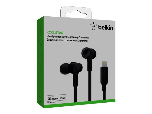 Belkin ROCKSTAR - Hörlurar med mikrofon - inuti örat - kabelansluten - Lightning - ljudisolerande - svart - för Apple 10.5-inch iPad Pro; iPad mini 4; iPhone 7, 7 Plus, 8, 8 Plus, X, XR, XS, XS Max G3H0001BTBLK